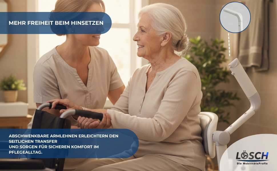 Beide Armlehnen lassen sich seitlich wegschwenken. Dies erleichtert Transfers vom Bett oder Rollstuhl und unterstützt die Selbstständigkeit im Pflegealltag.